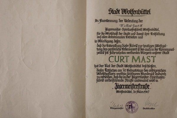 Spoločnosť mení názov na W. Mast Kommanditgesellschaft Jägermeister-Spirituosenfabrik. Po smrti Curta Masta preberajú oťaže spoločnosti z mesta Wolfenbüttel Günter Mast a Dr. Günther Findel.